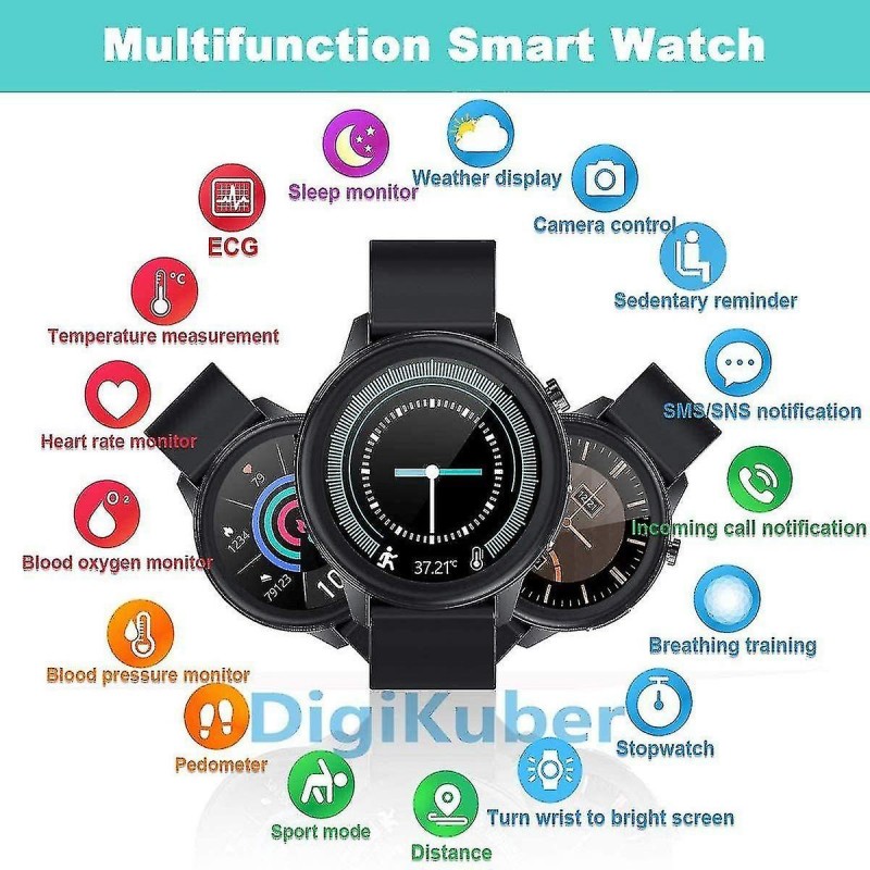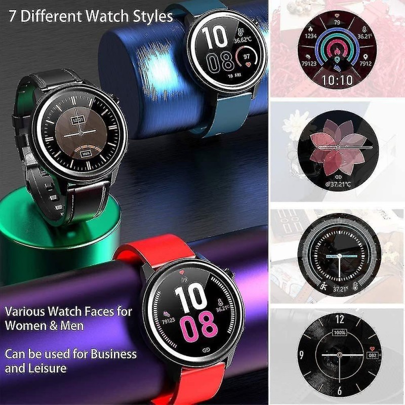 VERSCHIEDENE FUNKTIONEN wie Zeit- und Datumsanzeige, Wetteranzeige, Anruf- und Nachrichtenbenachrichtigung, Schrittzähler, Kalorienverbrauchsaufzeichnung, Sportkilometeraufzeichnung, 7 Sportmodi, Herzfrequenzmesser, EKG/PPG/Ai-Diagnose, Kamerasteuerung, Schlafmonitor, Bewegungserinnerung, Stoppuhr, Atemtraining. 24-STUNDEN-KÖRPERTEMPERATURMONITOR Es kann Ihre Körpertemperatur 24 Stunden lang messen, die Körpertemperaturdaten können in der [SmartHealth]-App gespeichert werden, Sie können Ihre Körpertemperatur überwachen und jederzeit Ihren Gesundheitszustand im Auge behalten. SPORT- UND GESUNDHEITSMANAGEMENT Verfolgung der Messung mehrerer Sport- und Gesundheitsdaten: Multisportmodus, Schrittzähler, Distanz, Kalorien; Diagnose von EKG/PPG/AI/Herzfrequenzmonitor. Achten Sie stets auf Ihre Gesundheit. Die Sport- und Gesundheitsdaten auf der Smartwatch dienen nur als Referenz. Bitte befolgen Sie den Rat Ihres Arztes. SCHLAFÜBERWACHUNG & ZEITANZEIGE Schlafüberwachungsfunktion: Wenn Sie einschlafen, berechnet die Smartwatch automatisch Ihre Schlafqualität und synchronisiert die Daten mit der App. Sie können die Schlafqualität erkennen. Die Wetteranzeigefunktion zeigt aktuelle Wetterinformationen und die Luftqualität an. (Hinweis: Sie müssen die Standortinformationen von Ihrem Telefon abrufen, um das Wetter anzuzeigen.) IP68 WASSERDICHT UND MAGNETISCH LADEN IP68 bietet eine hervorragende Wasserdichtigkeit und kann die meisten täglichen Anforderungen erfüllen. (Hinweis: Tauchen Sie es nicht für längere Zeit in tiefes Wasser. Verwenden Sie es auch nicht in heißen Quellen oder heißen Bädern.) Aufladen durch magnetische Saugkraft, Ladezeit ca. 3–4 Stunden, Nutzungsdauer ca. 5–13 Tage, Standby-Zeit ca. 20–40 Tage.